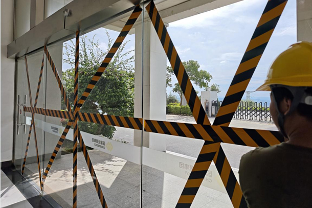 图为场站值守人员加固门窗