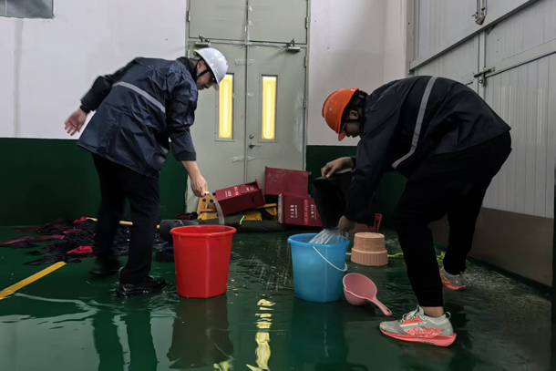 图为场站值守人员清理倒灌的雨水